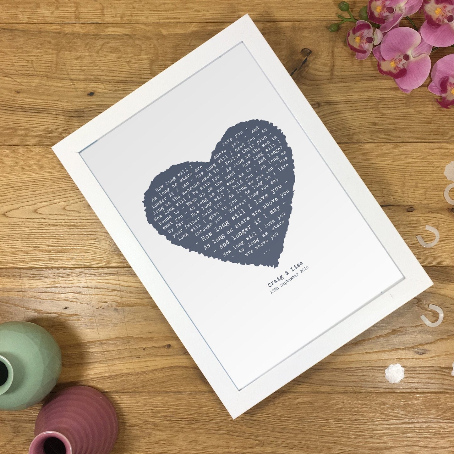This unique typography product features personalised song lyrics and makes a perfect gift for romantic occasions such as weddings, first anniversaries, and Valentine's Day. It's also an ideal engagement present for newlywed couples.