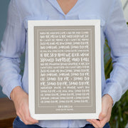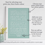 Looking for a wall-filling print that's both stunning and contemporary? Our unique fonts and professionally designed song lyrics typography print never disappoint! Our personalised song lyrics print makes for a charming wedding or anniversary gift, but its versatile style also makes it a hit for birthdays, graduations, and farewell presents. With each design thoughtfully created and lyrics carefully considered, this one-of-a-kind piece is sure to span the ages and any words.