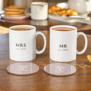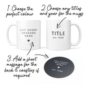 This mug gift set is fully customisable. Add ANY title to the mugs (MR, MRS, MX, DR, LADY... you name it!), any year they were married or became a couple and any short message for the back of the mugs and on the coasters (if you don't give us one we'll add 'Happily Ever After').