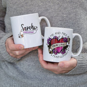 Mug Set For Couple - Sugar Skull Daisies And Illustrated Heart Tattoo Personalised - Wedding Gift