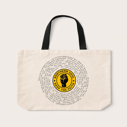 Northern Soul Lyrics Tote Bag – Keep The Faith Celebrate the timeless spirit of Northern Soul with this stylish lyric tote bag. Featuring the iconi...