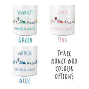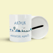 To the front is a vibrant mountain scene featuring a hot air balloon and boat along with the message 'Adventure Awaits' plus the name of the child. Kids can save their pennies by popping their money in the slot in the top and there's a rubber stopper in the bottom for when it's time to raid the piggy bank.