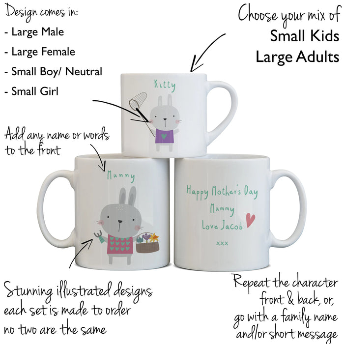 Spring bunny rabbits in a matching family mug set - whether it's a 'Mummy & Me', 'Daddy & Me' or a whole family of bunnies you're after we've got you covered with a great Gift for Easter 2025