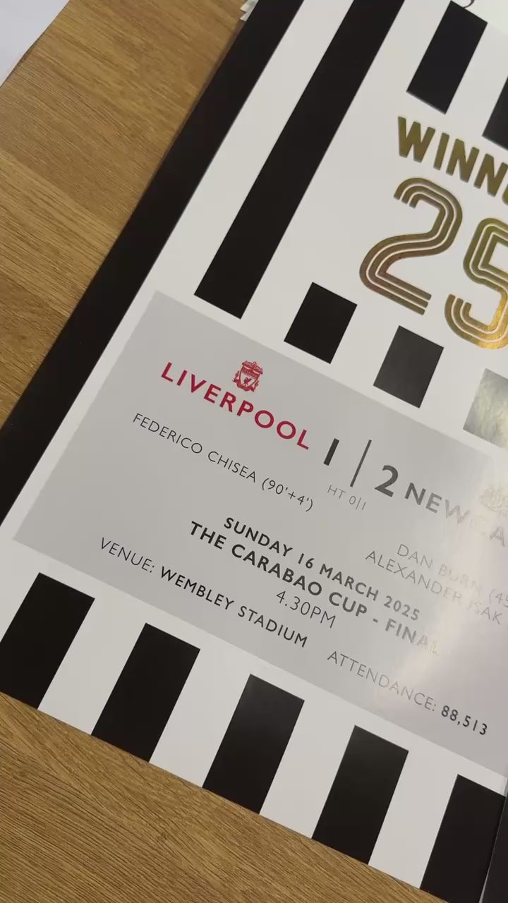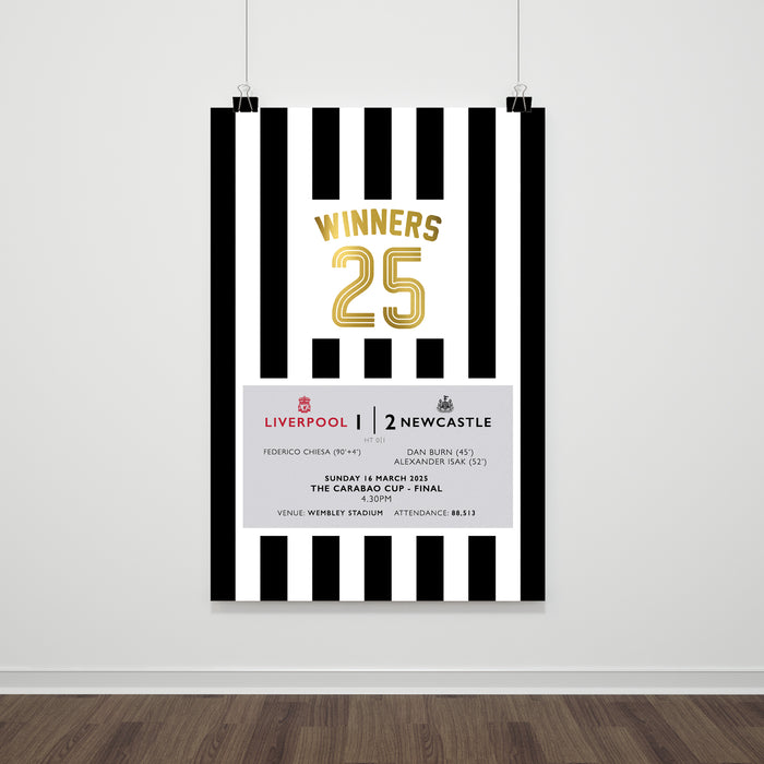 Celebrate Newcastle United’s historic 2025 Carabao Cup Final victory with this stunning commemorative print! Featuring the official match details from their 2-1 win over Liverpool at Wembley, this unique design is the perfect keepsake for any passionate Toon Army supporter.
