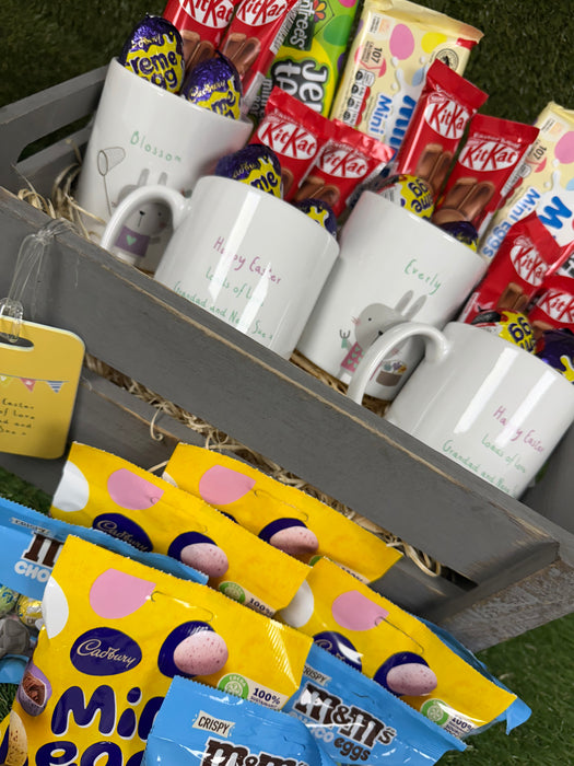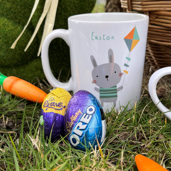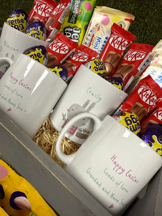 Our personalised bunny easter gift set comes with personalised kid sized 6oz ceramic mug and full optional Easter eggs or full Easter hamper.