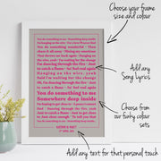 Each design features your chosen lyrics styled elegantly within a bordered layout, printed on premium matte paper and framed in your choice of colour. Add names, a date, or a personal message to make it truly yours — perfect for anniversaries, weddings, engagements, or Valentine’s Day.