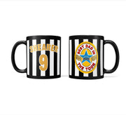 The black and white striped mug has a matching black handle and inner. You can opt to have the 'Best Dad in the Toon' logo on both sides, or choose the vintage NUFC strip with any name and number written in gold.