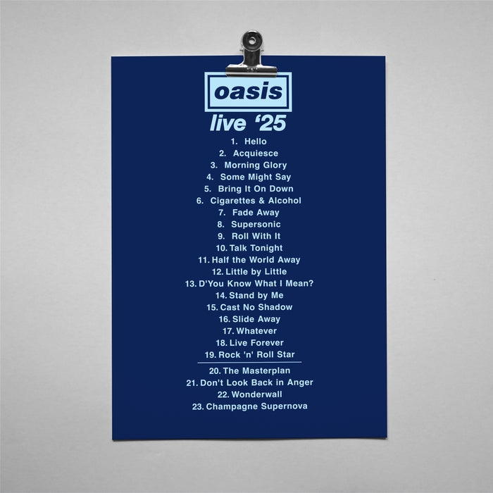 Celebrate 25 years of absolute classics with this bold Oasis Live '25 setlist print, featuring 23 iconic tracks including Wonderwall, Champagne Supernova, Don't Look Back in Anger, and more. The perfect wall art for any true Oasis fan.