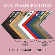 FSC accredited Real wooden frames in 8 colour options with recycles safety 'glass' acrylic fronts.