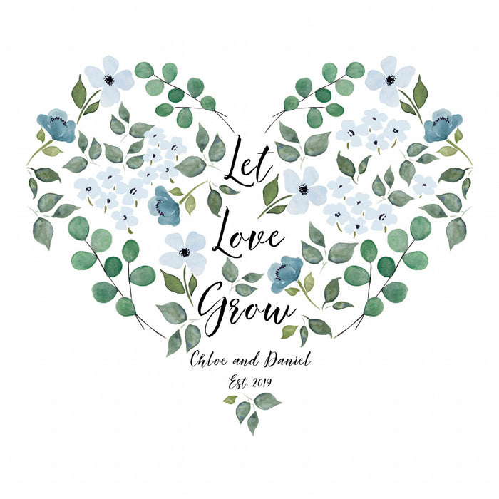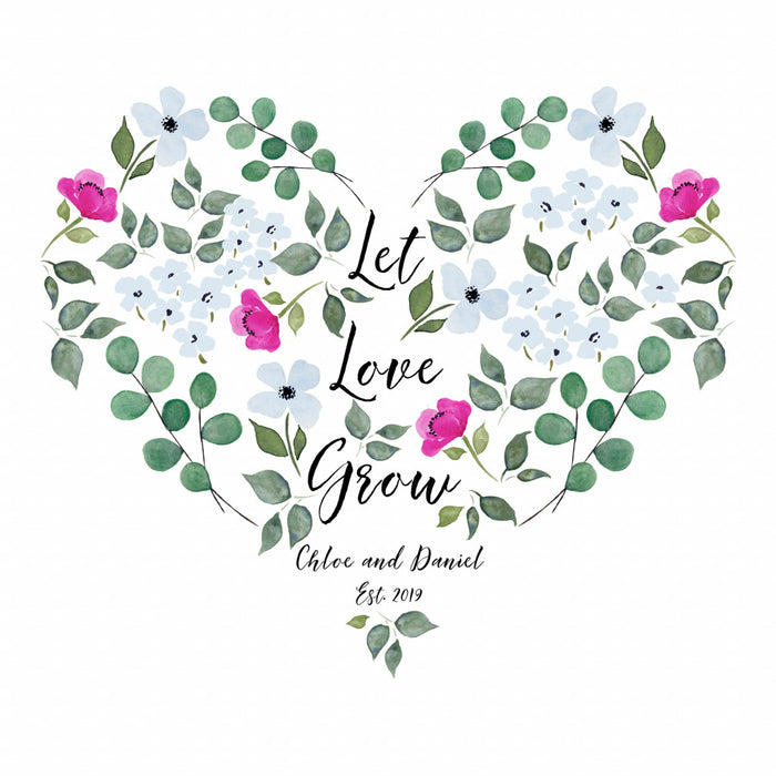 Let it grow, let it grow, let it blossom, let it flow‚ said Eric Clapton in one of his finer moments. Our botanicals print captures that same essence but this time in a beautiful floral print based on an original watercolour by our designer Laura. With it's Let love grow motif and personalised with names and a date it makes for a great wedding gift.